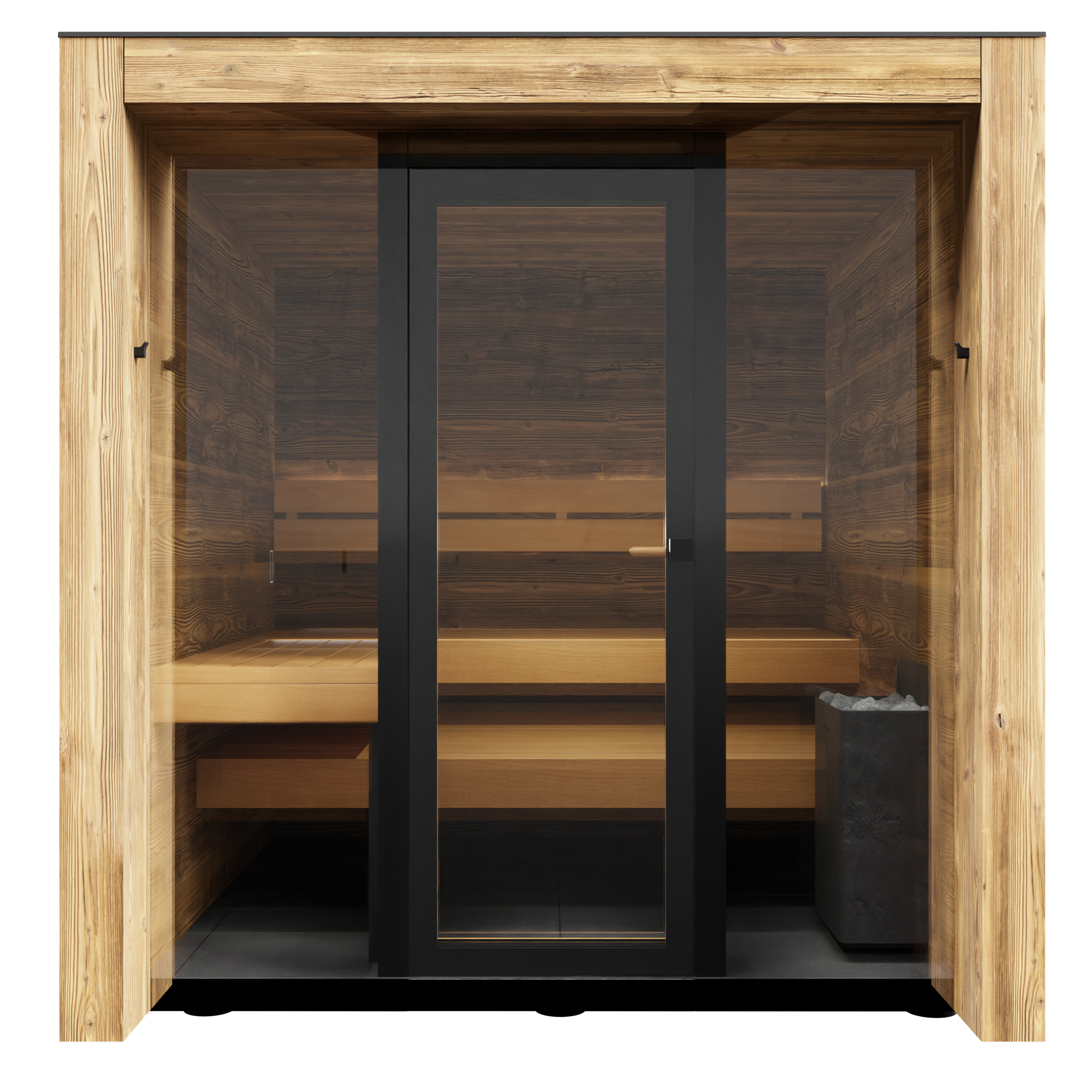 Fortis is a sleek, enclosed outdoor sauna built for 3–4 people, offering a private yet light-filled retreat. Its modern eave-style roofline and glass front bring a contemporary edge to any outdoor setting, while the insulated construction ensures year-round comfort. Inside, brushed thermally modified wood walls and aspen benches create a warm, inviting atmosphere, enhanced by integrated LED color lighting.